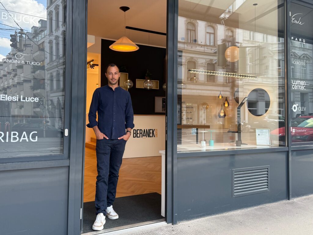 Ich habe vor fünf Jahren begonnen, hier zu arbeiten. Allerdings nur für sechs Monate – coronabedingt und weil ich von einem Mitbewerber abgeworben worden bin. Damals wollte ich schon das Geschäft übernehmen, doch da hat es sich nicht ergeben. Dann habe ich meine Reise in der Beleuchtungsbranche fünf Jahre lang fortgeführt, aber gemerkt: So ein Geschäft wie den Beranek gibt es sonst nicht in Wien. Es sind alle fokussiert auf die Premiummarken, aber nicht auf die kleinen europäischen Manufakturen mit 15 bis maximal 100 Mitarbeitern. Doch genau das sehe ich als Nische und Chance, dass wir so etwas Großes schaffen auf der Lerchenfelder Straße.